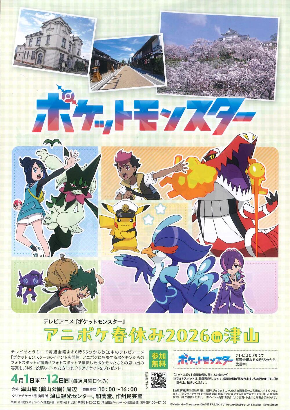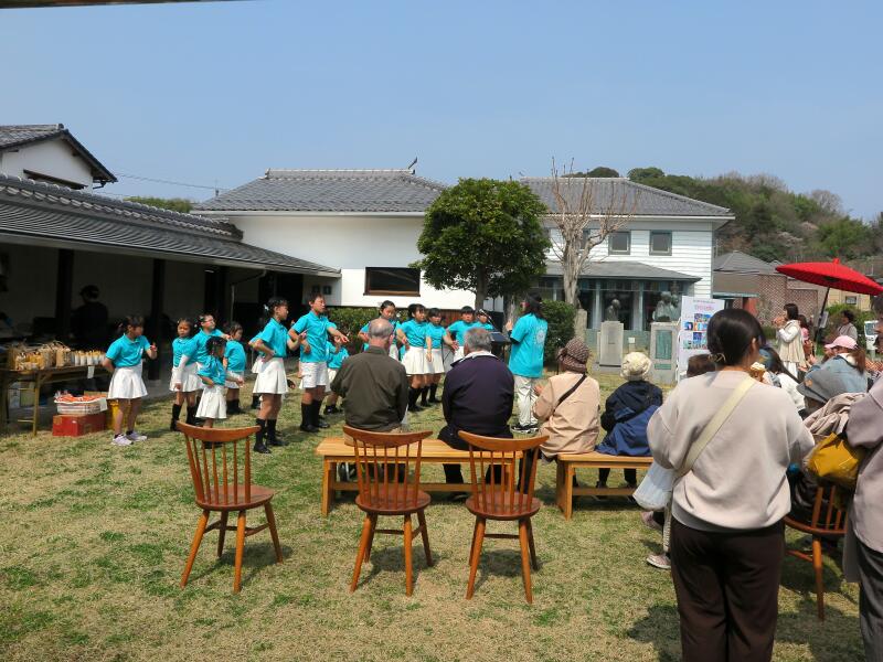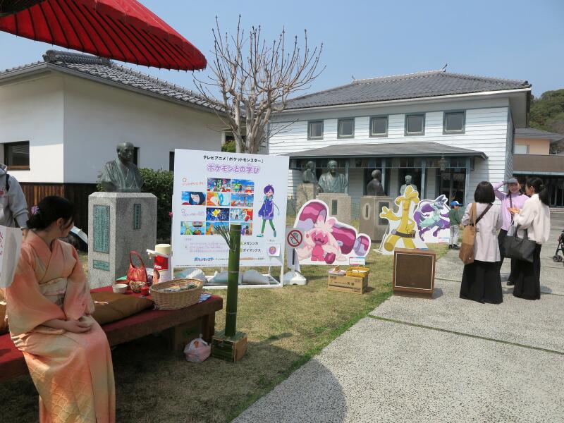 みんなでラジオ体操や子ども達の合唱や女性コーラスなどの歌声があり賑やかでした。ワークショップでは折り紙でお雛様を作ったり、お抹茶体験、ハンドマッサージ、アロマ体験コーナーもありで皆さん楽しまれていました。また、津山洋学資料館前芝生広場では「アニポケ春休み2026 in 津山」が同時開催されており皆さん記念写真を撮られていました。