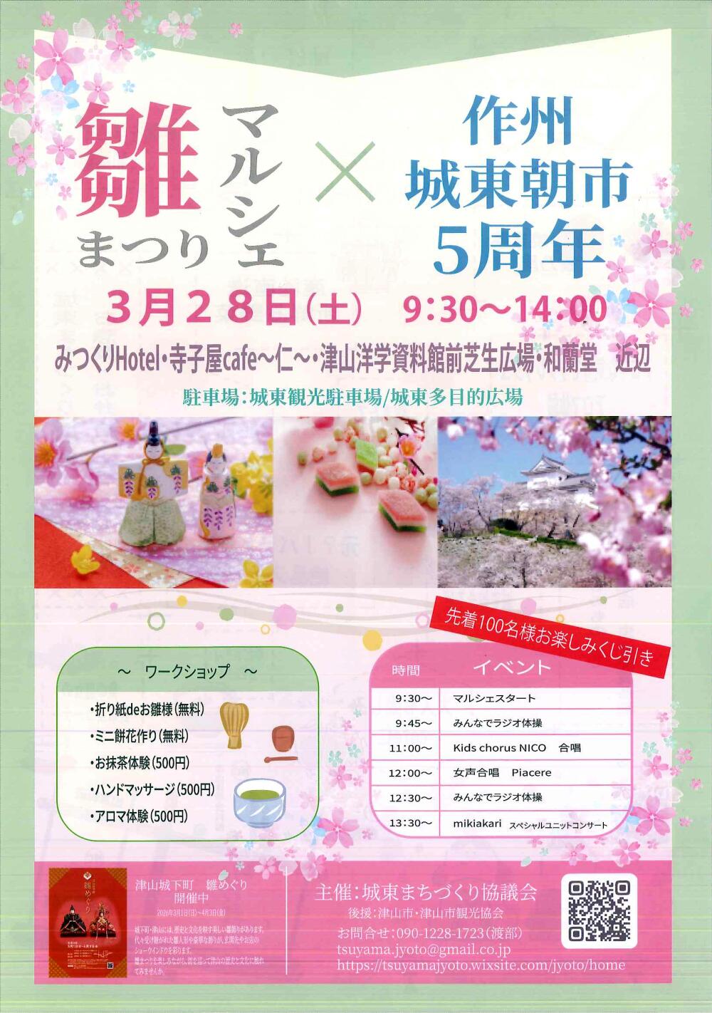 2026年3月28年、津山市城東地区にある、みつくりHotrl・寺子屋cafe~仁~・津山洋学資料館前芝生広場・和蘭堂の周辺で「雛まつりマルシェ×作州城東朝市5周年(城東まちづくり協議会主催)」が行われました。