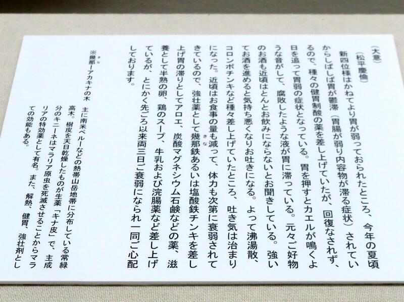 新四位様はかねてより胃が弱っておられたところ、今年の夏頃からしばしば胃が鬱滞(胃腸が弱り内容物が滞る症状)されているので、種々の健胃制酸の薬を差し上げていたが、回復なされず、日を追って胃弱の症状となっている。胃を押すとカエルが鳴くような音がして、腐敗したような液が胃に滞っている。元々ご好物のお酒も近頃はほとんとお飲みにならないとお聞きしている。強いてお酒を進めると気持ち悪くなりお吐きになる。よって沸湯散、コロンボチンキなど種々差し上げていたところ、吐き気は治まりになった。近頃はお食事の量も減って、体力も次第に衰弱されてきているので、強壮薬として幾那鉄あるいは塩酸鉄チンキを差し上げ胃の滞りとしてアロエ、炭酸マグネシウム石鹸などの薬、滋養として半熟の卵、鶏のスープ、牛乳および浣腸薬など差し上げているが、とにかく先ごろ以来両三日ご衰弱になられ一同ご心配 しております。