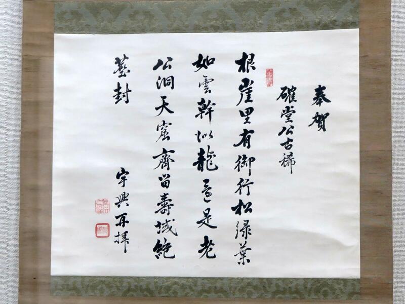 津山藩松平家第8代藩主であった松平斉民(なりたみ)の古希(70歳)を祝して詠んだ漢詩をしたためたものです。 「確堂(かくどう)公」とあるのが斉民のことで、最後にある「宇興」は興斎のことです。