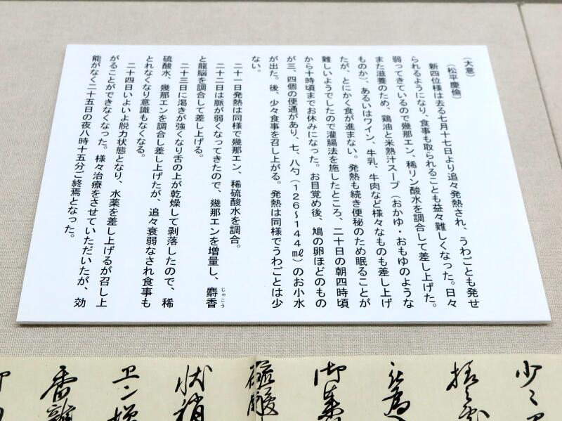 二十三日に渇きが強くなり舌の上が乾燥して剥落したので、稀硫酸水、幾那エンを調合し差し上げたが、追々衰弱なされ食事もとれなくなり意識もなくなる。