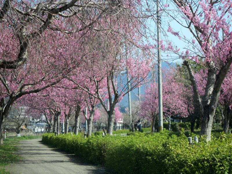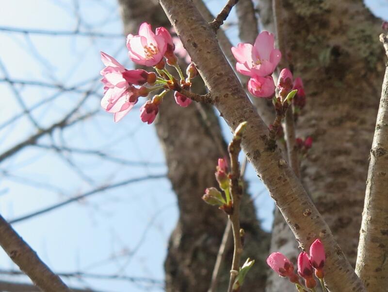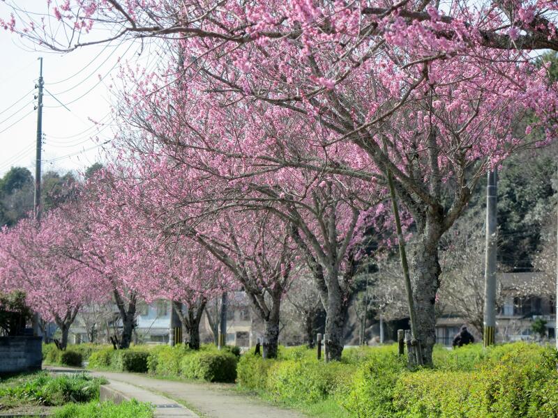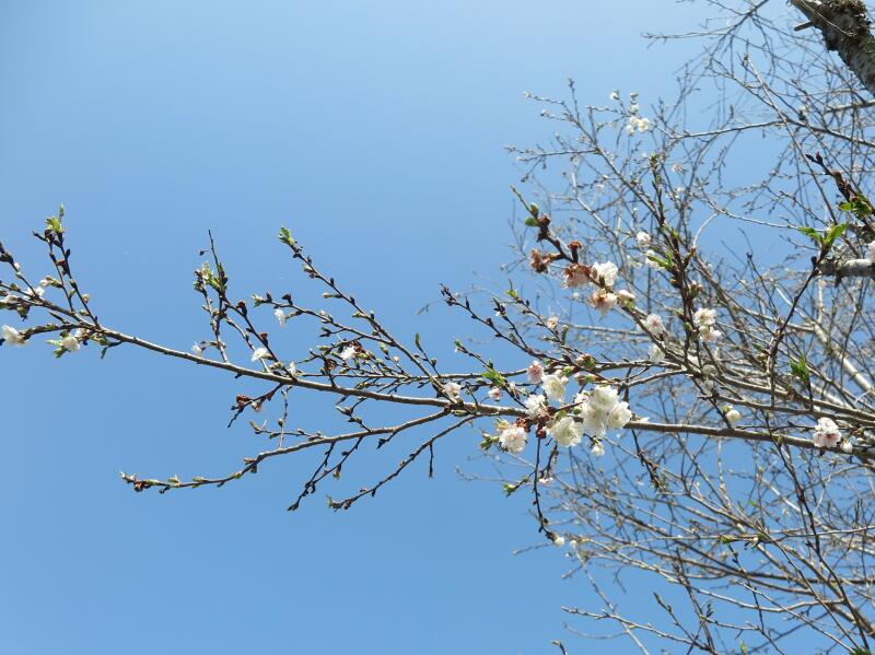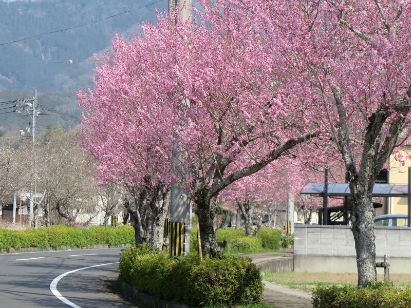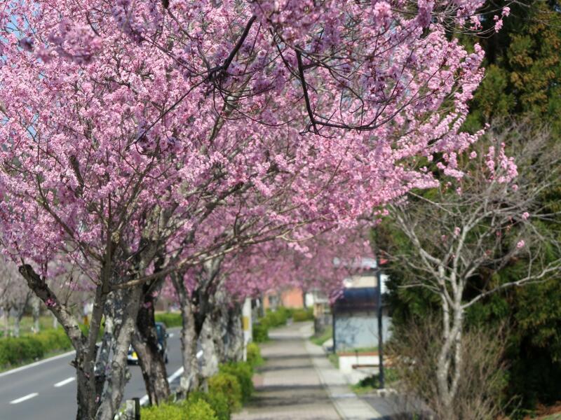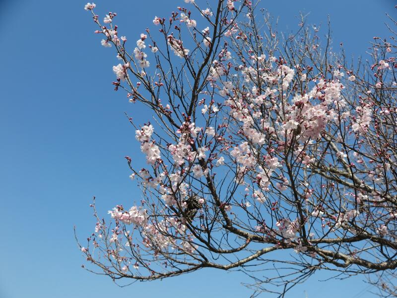 ここの通りのさくらの木は数種類ありますが、一番多くて目立つのが濃いピンクのさくらです。ここのさくらの花が津山でも一番早く咲くように思います。毎年さくら満開のころに通るのを楽しみにしています。また、川岸にはムスカリの花も目を引きましたが、綺麗な羽のキジがいて見とれてしまい写真を撮るのがおくれました。